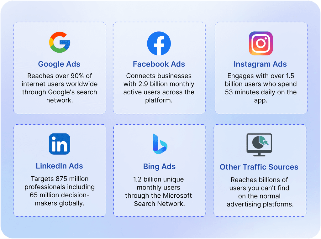 We leverage multiple traffic sources including Google, Facebook, Instagram, LinkedIn, and Bing to help expand your reach. With up to 10 different potential channels.